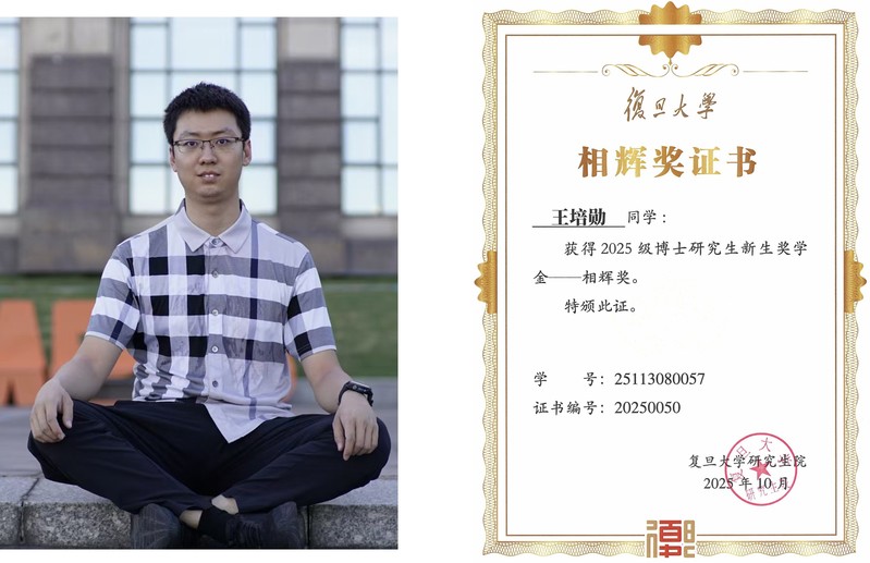 祝贺25级博士新生王培勋获得复旦大学相辉奖学金!该奖项是复旦大学为吸引和激励优秀新生而设立的重要荣誉,旨在表彰具有突出学业表现的优秀学子。这一荣誉不仅是对其个人能力的充分肯定,也是对其勤奋进取、追求卓越精神的高度认可,为课题组增添了新的光彩。
