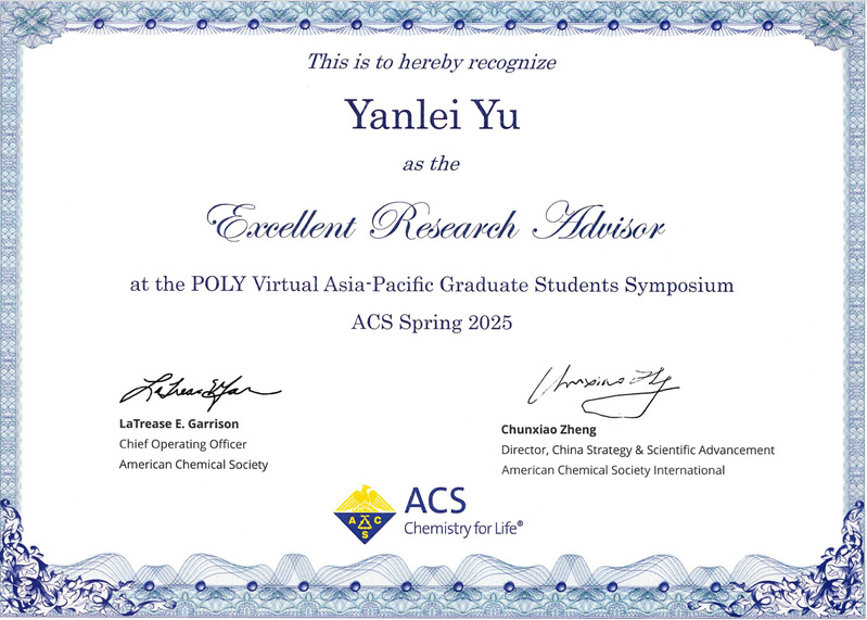 这份荣誉的取得,也离不开课题组良好的学术氛围与导师的悉心指导,俞燕蕾教授同时获得了杰出指导奖!它既是个人学术道路上的高光时刻,也是我们整个科研团队协同创新、集体智慧的结晶。我们相信,这将极大地激励课题组全体同学在各自的科研道路上奋勇前行,再创佳绩!
