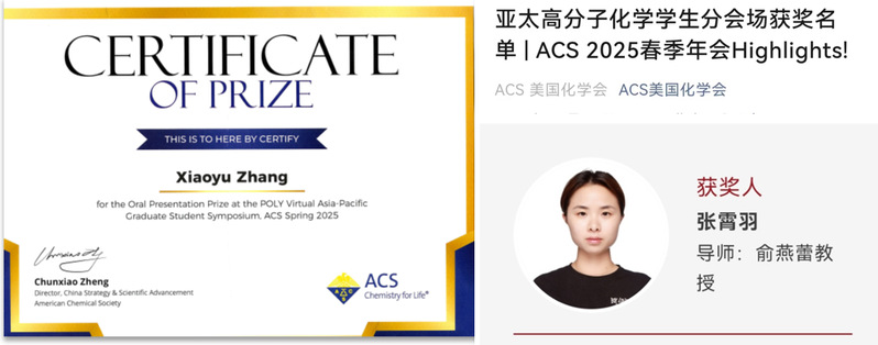 近日,我组博士生张霄羽受邀在美国化学会春季会议“ACS Spring 2025”作口头报告,获优秀报告奖!这份国际荣誉背后是她数年如一日的潜心钻研与不懈求索。从实验设计的精益求精,到理论模型的反复推敲;从数据整理的严谨细致,到报告演练的字斟句酌,她以卓越的科研素养和勤奋的治学态度,为我们全体组员树立了光辉的榜样。