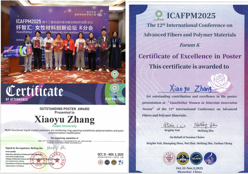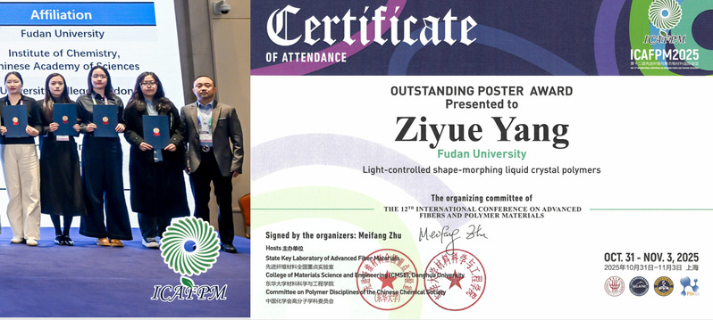 热烈祝贺!欣闻喜讯,本课题组再传捷报!在刚刚落幕的第十二届先进纤维与聚合物材料国际会议上,本组博士生张霄羽与杨紫悦凭借其出色的研究成果海报,从众多参会者中脱颖而出,双双荣获优秀海报奖,其中张霄羽还获得会议特设第一届k分会杰出海报奖!